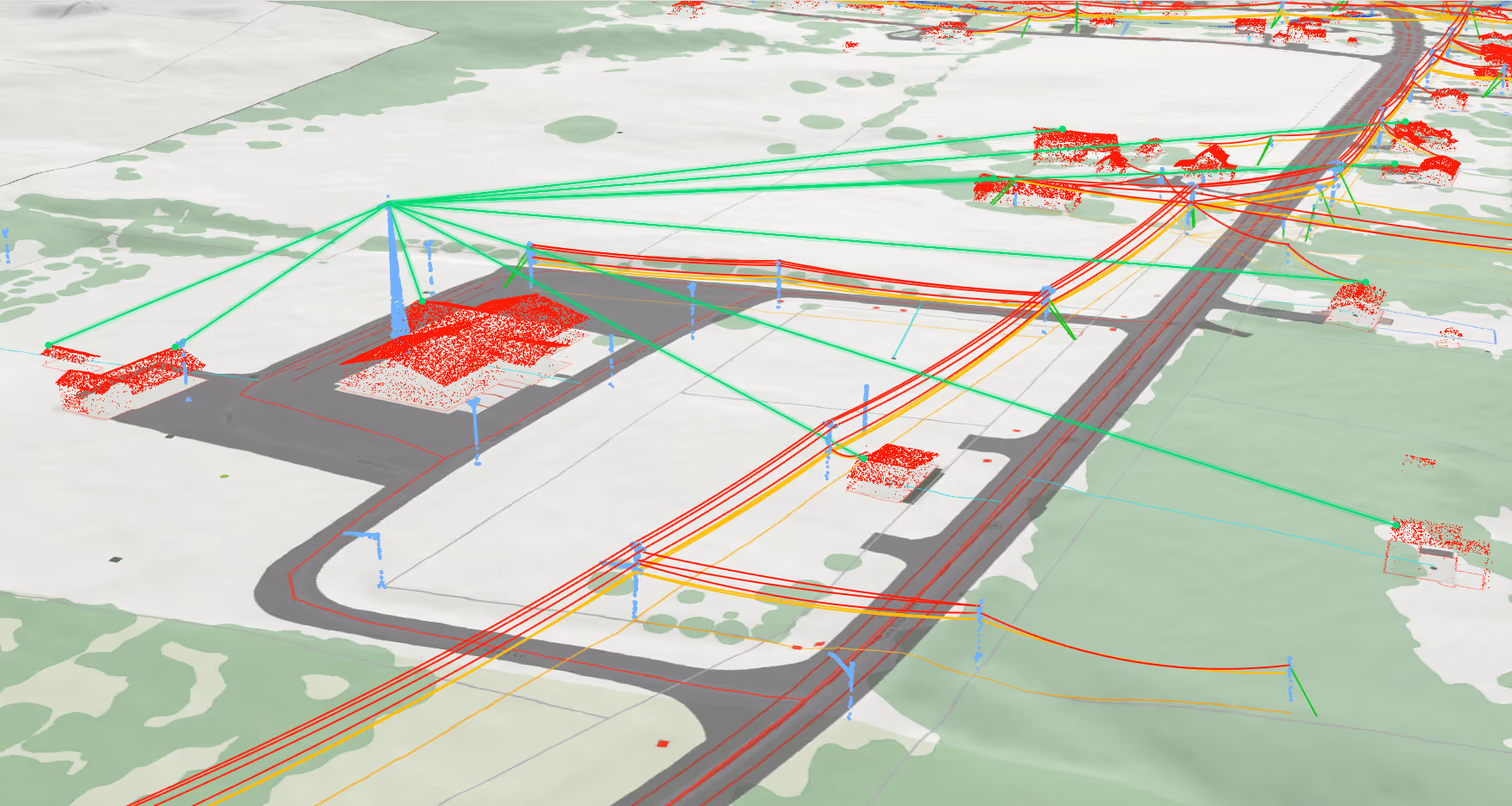 AirWorks supports aerial network design with detailed 3D outputs derived from LiDAR and high-resolution imagery. We extract pole measurements and locations, attachments, vertical clearances, vegetation encroachments, and surrounding infrastructure to give your team a precise digital view of the existing environment. This allows engineers to validate feasibility, identify make ready and pole-loading requirements, and develop aerial routes with greater speed and confidence.